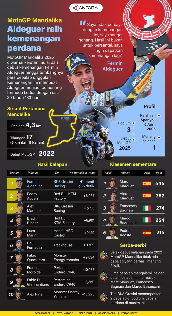 MotoGP Mandalika 2025 diwarnai kejutan mulai dari debut kemenangan Fermin Aldeguer hingga tumbangnya para pebalap unggulan. Kemenangan ini membuat Aldeguer menjadi pemenang termuda kedua dengan usia 20 tahun 183 hari.